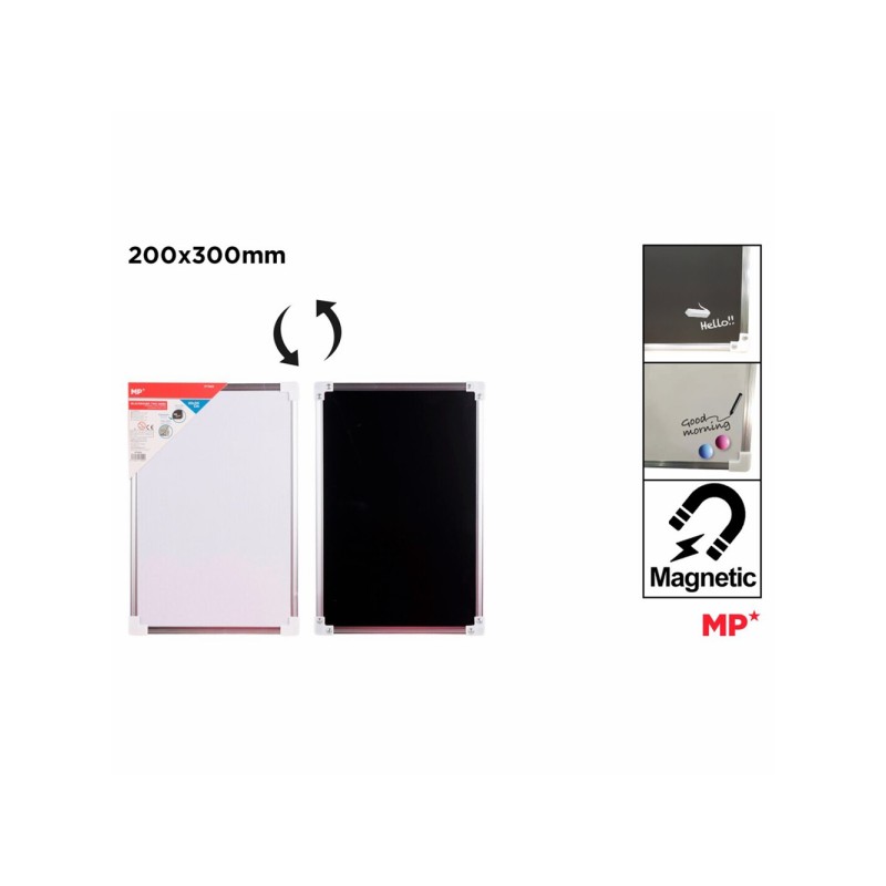 Tabla cu doua fete: una alba magnetica pentru a scrie cu markere pentru tabla si o alta parte neagra pentru a scrie cu creta. Cadru din aluminiu cu colturi pentru o mai mare protectie. Nu include magneti, creta sau markere. Dimensiuni: 20 x 30 cm