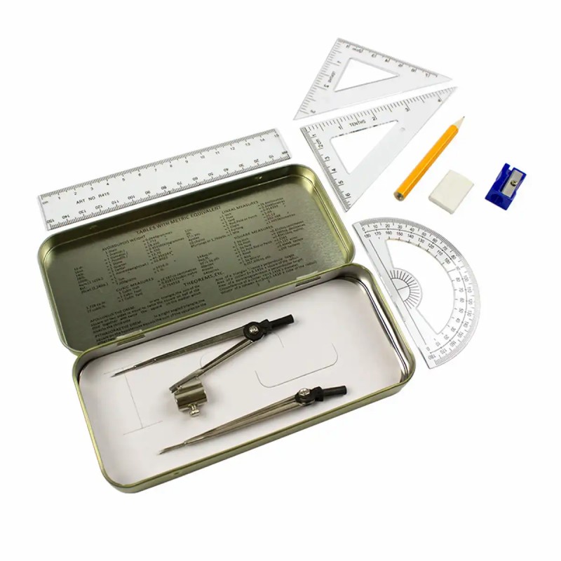 Trusa contine: compas, distantier, creion grafit, radiera, ascutitoare, rigla 15 cm, echer echilateral (45/45 grade), echer dreptunghic (30/60/90 grade), raportor