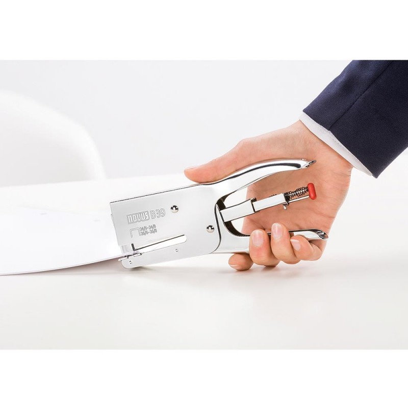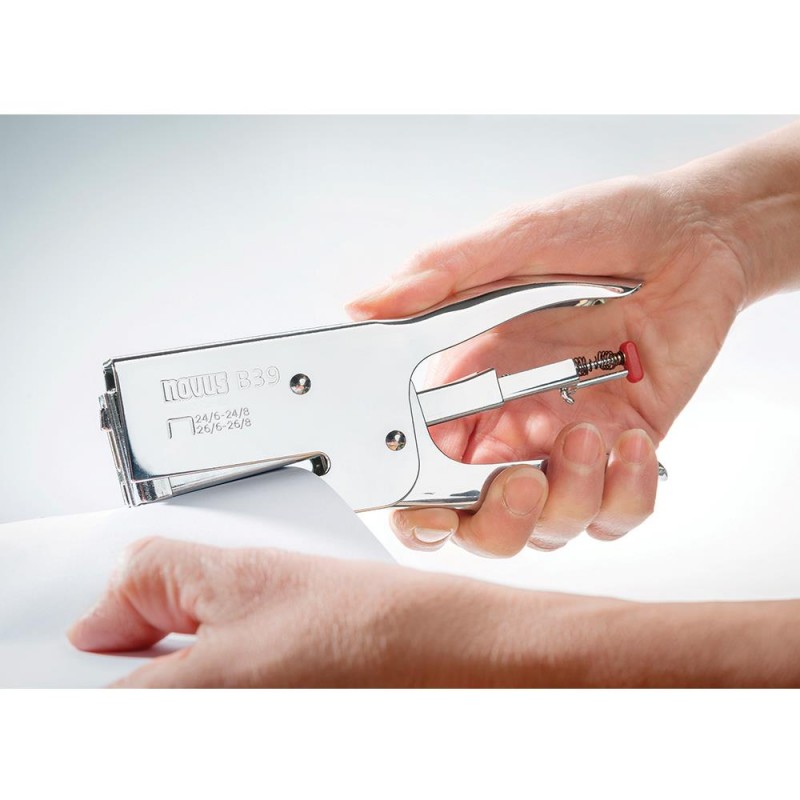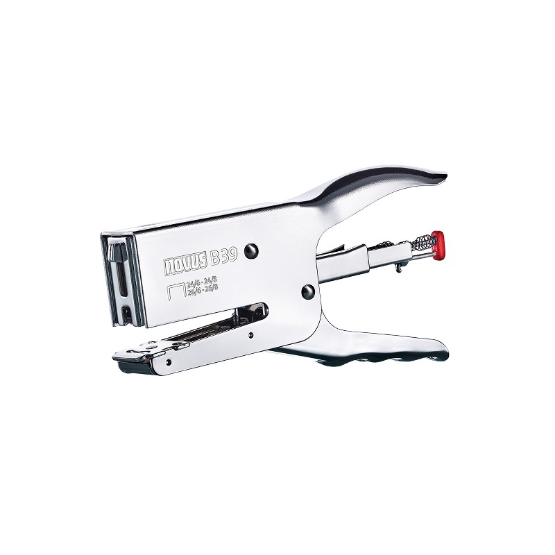 Acest capsator de birou Novus B39 metalic este de tip cleste. Acesta se poate folosi de catre oricine cu usurinta si comoditate. Acest capsator are o culoare cromata. Este dotat cu un sistem anti-blocare pentru o capsare comoda, fara probleme. Incarcarea capselor se efectueaza pe partea superioara. Capacitatea de capsare este de 50 de coli. Adancimea de patrundere in pagina este de 50 mm.