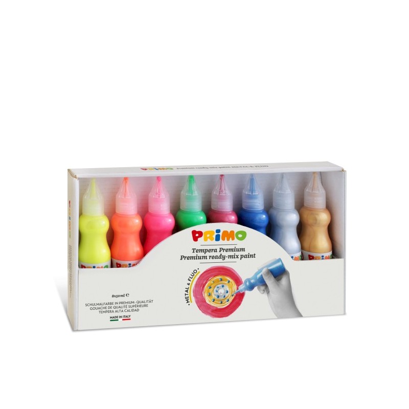 Tempera Morocolor cu mecanism de control al debitului 4 culori fluorescente si 4 culori metalice a cate 50 ml. Poate fi utilizat pe diferite suprafete, cum ar fi hartie, carton, lemn, tesatura, sticla, teracota, metal si plastic. Vopseaua nu este permanenta, dar poate fi fixata cu un fixativ adecvat. Poate fi utilizat impreuna cu intreaga gama de produse pe baza de apa Morocolor.