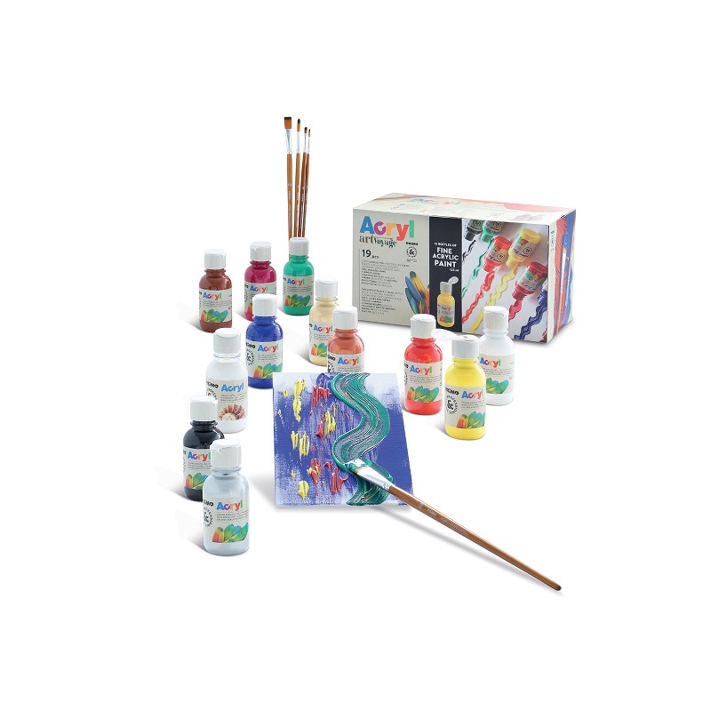 Set de arta cu vopsea acrilica fina in sticle de 125 ml, 11 culori, 1 lac lucios, 2 placi de panza 18 x 24 cm, 5 pensule: 2 rotunde 5, 8; 2 plate 6,10,18.