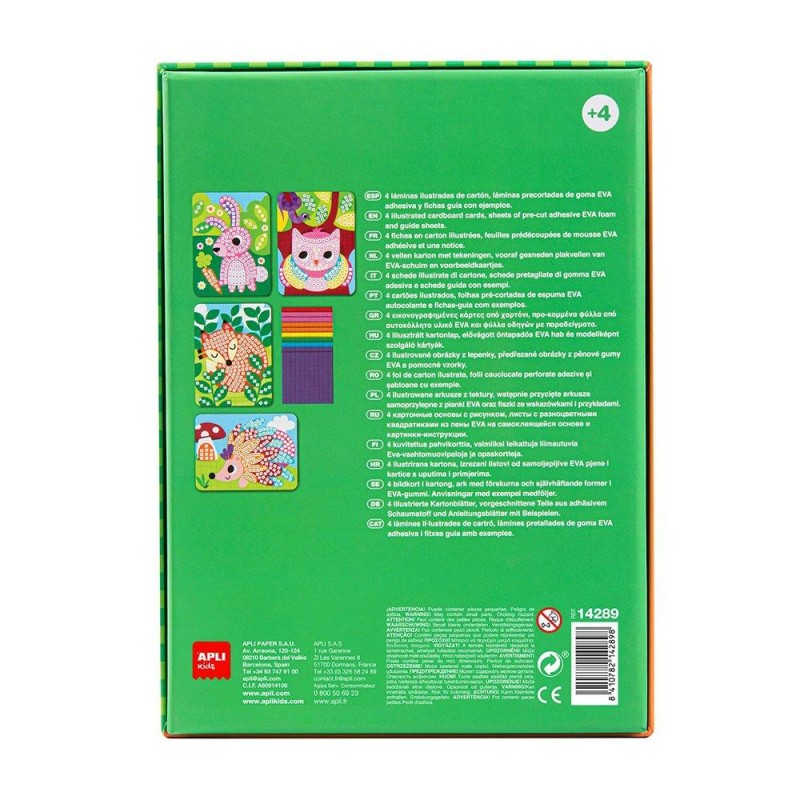 Joc pentru a crea mozaicuri cu spuma pre-taiata adeziva EVA in diferite culori si finisaje. Model de animale. Jocul consta in completarea desenelor de pe carti cu spuma adeziva EVA pentru un finisaj spectaculos. Un produs cu un con?inut excelent: include un ghid, 6 coli de spuma EVA adeziva, pre-taiate si in diferite culori, 2 carti de gramaj ridicat tiparite color si cu diferite modele: bufnita si arici. Usor de utilizat: cardurile din carton au spatii goale cu puncte colorate ca ghid pentru umplerea cu spuma EVA de culoarea potrivita. Un produs cu valoare didactica ridicata, perfect pentru dezvoltarea abilitatilor copiilor: Dexteritate si precizie, precum si stimularea abilitatilor motorii fine, lucrul la coordonarea mana-ochi si favorizarea orientarii spatiale. Recomandat copiilor cu varsta de cel putin 4 ani.