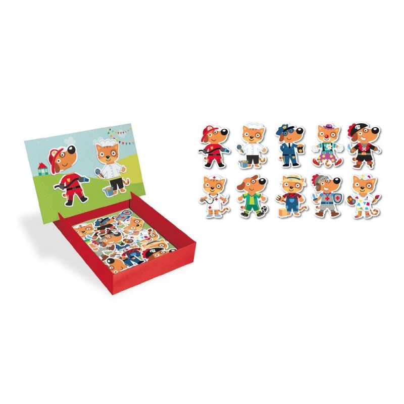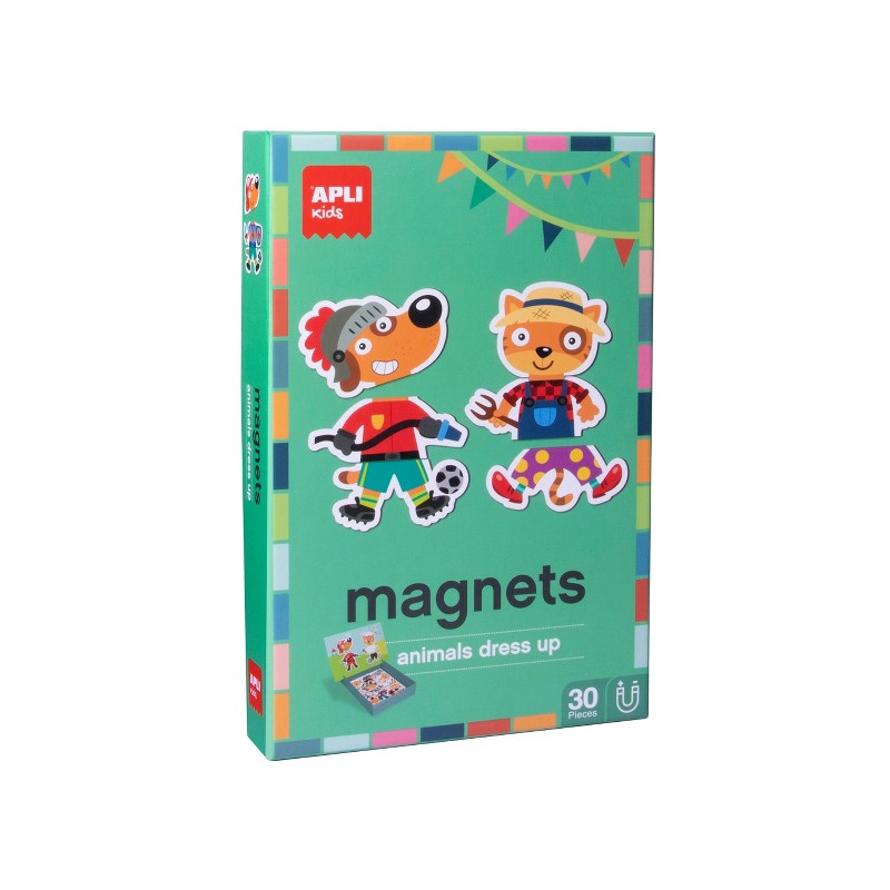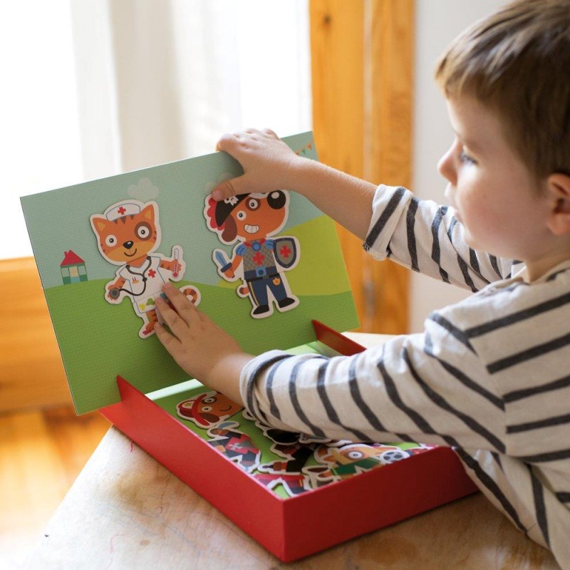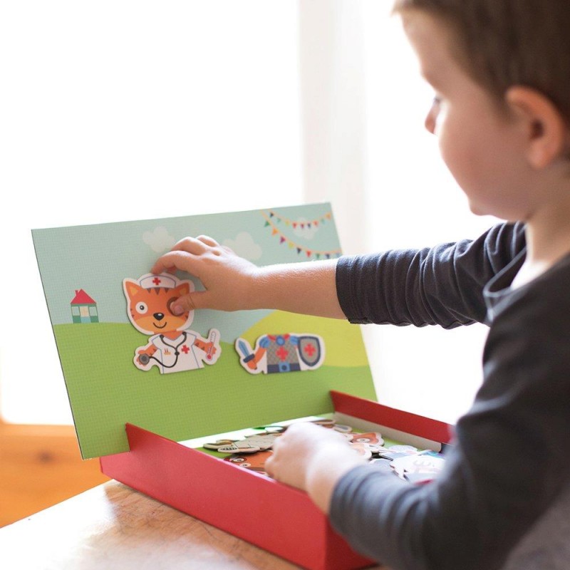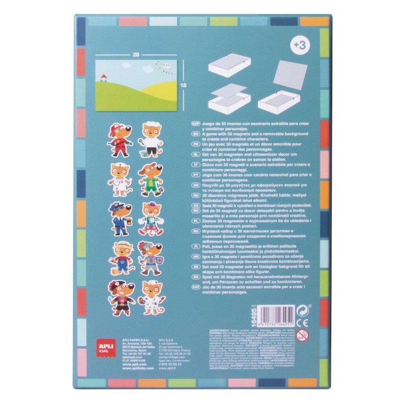 Joc magnetic, model Dress up, pentru a asocia partile diferitelor personaje si a invata profesiile. Descoperiti profesia fiecarui personaj sau creati compozitii infinite noi! Fiecare joc con?ine: 1 scena magnetica de 28 x 18 cm pentru a se potrivi pe baza cutiei si 30 de magneti pentru a crea diferite personaje. Un design exclusiv APLI Kids cu ilustratii originale si colorate. Valoare didactica ridicata: incurajeaza observarea si imaginatia; creste concentrarea si atentia, generand interes pentru obiecte, animale si personaje pe care nu le cunosc. Recomandat copiilor cu varsta de cel pu?in 3 ani.
