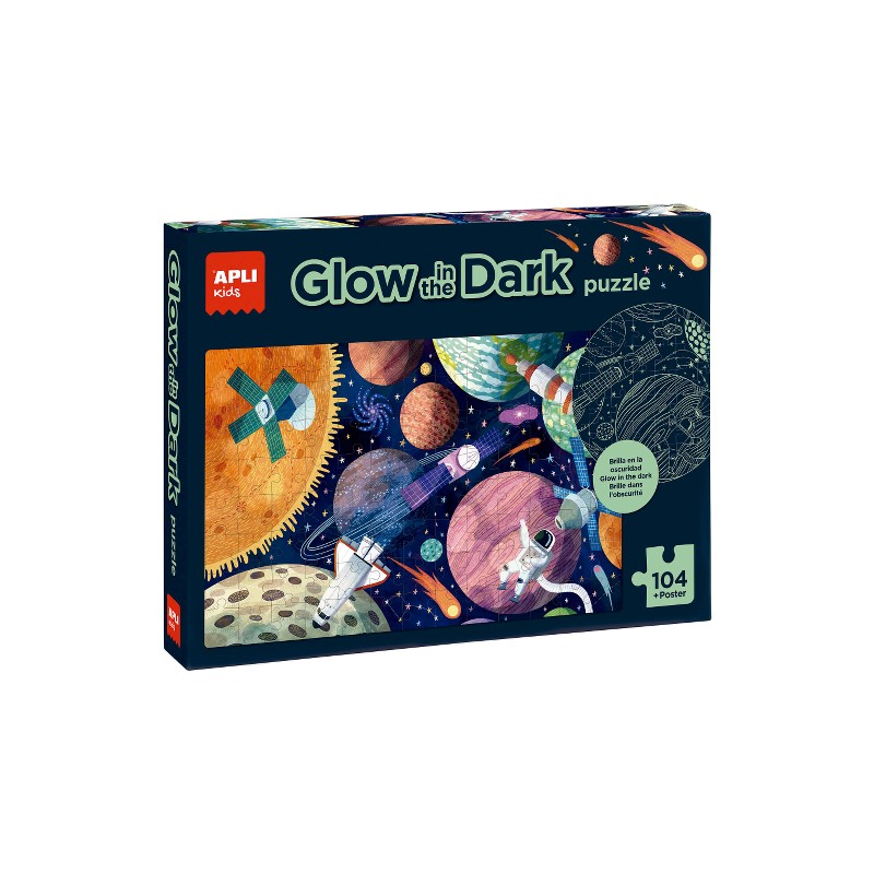 Puzzle fluorescent „Stralucire in intuneric” cu tema Sistemului Solar. Include 104 bucati marimea 5 x 5 cm. Dimensiune puzzle: 64,5 x 41,5 cm. Contine un poster de dimensiune completa pentru asamblare usoara.