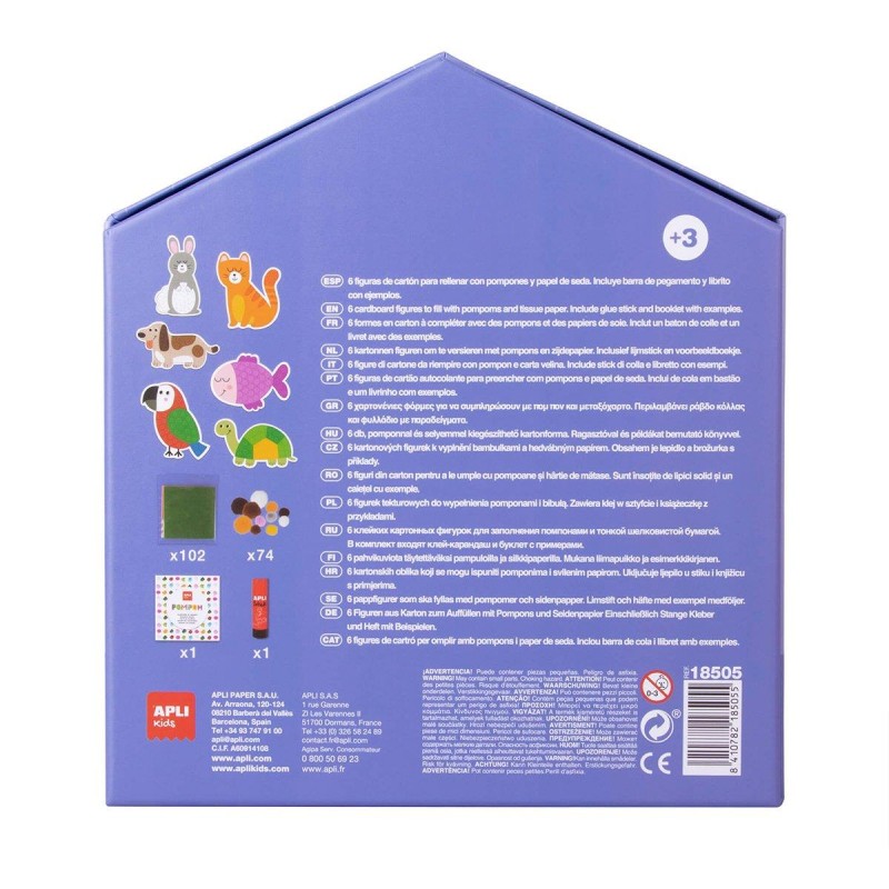 Set de pompoane din colectia My first cu tematica animala. Jocul consta in crearea si lipirea pomponilor in zonele indicate ale fiecarui design. Include 6 foi XL predecupate in forma de diverse animale domestice, 102 coli de hartie absorbante si 74 de pompoane de diferite culori si marimi, 1 baton de lipici de 20 gr, 1 carte cu instructiuni si exemple creative in desfasurarea activitatii.