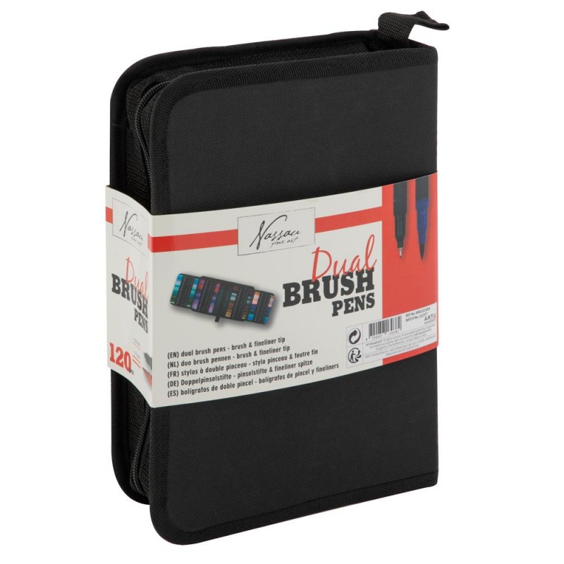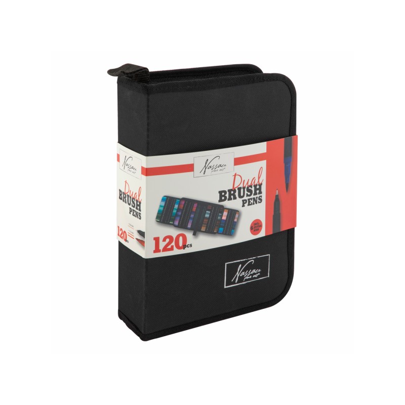 Set 120 markere Nassau Fine Art cu 2 capete tip liner si pensula in etui