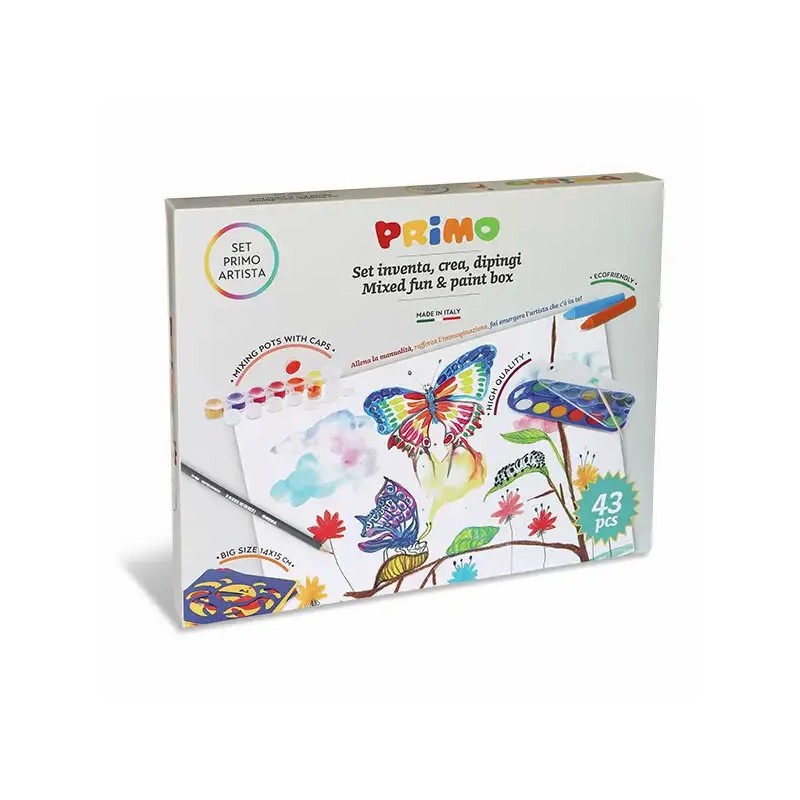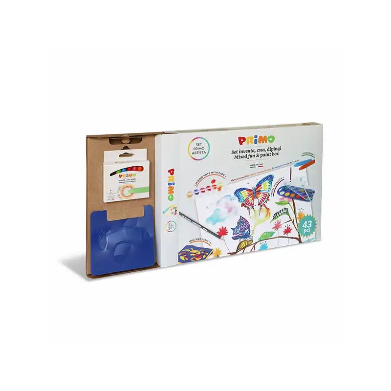 Set creativ 6 sabloane acuarele, 12 culori, 8 creioane cerate, tempera, 14 culori, 1 pensula, 1 creion HB