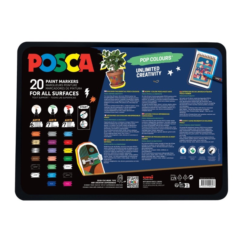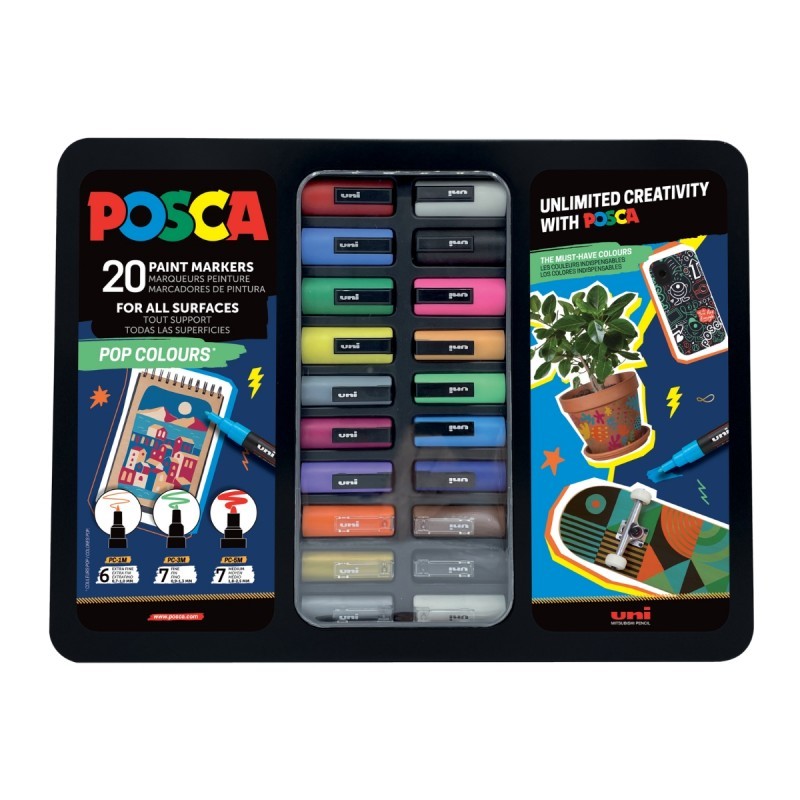 Set 20x Marker UNI Posca POP Colours, cutie metalica (6x PC-1M, 7x PC-3M, 7x PC-5M)
