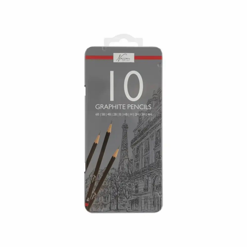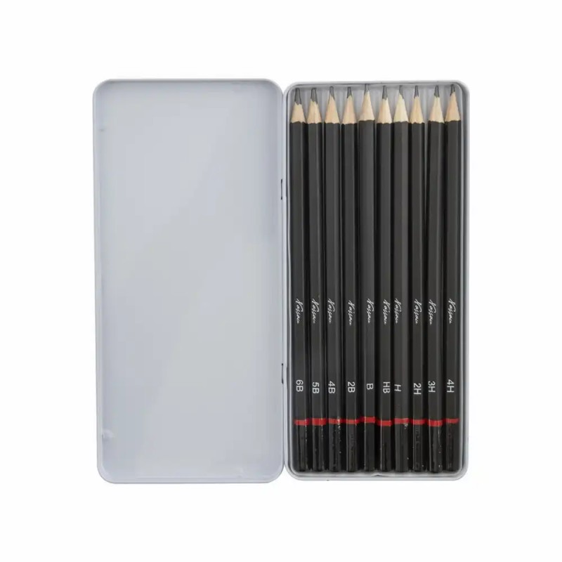 - Setul include 10 creioane cu duritati diferite, permitand o gama larga de expresii artistice.
