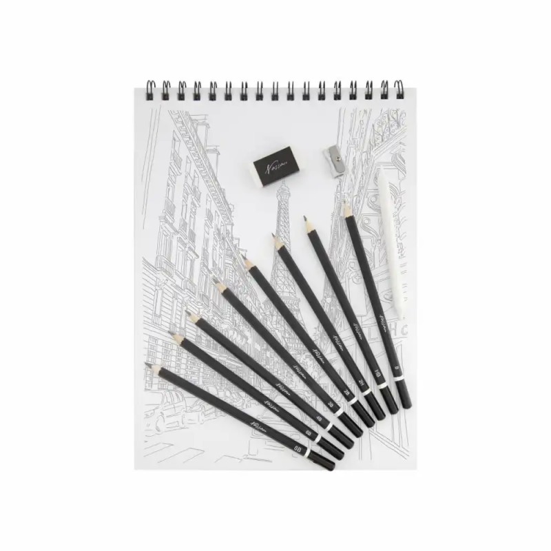 - Varietate de instrumente: include creioane, radiera, ascutitoare si alte accesorii esentiale pentru schitare.