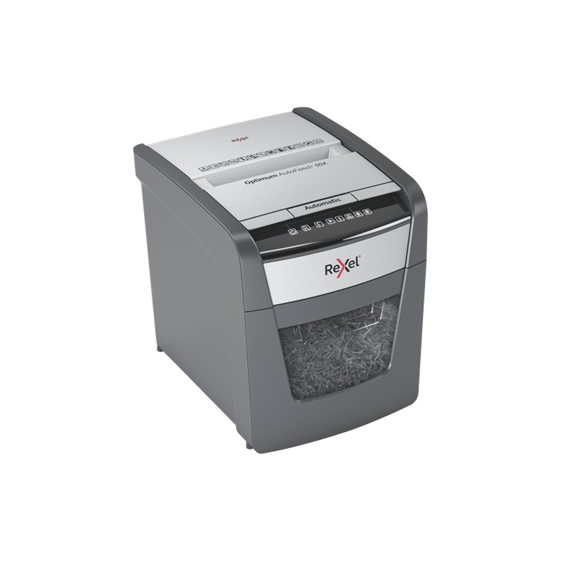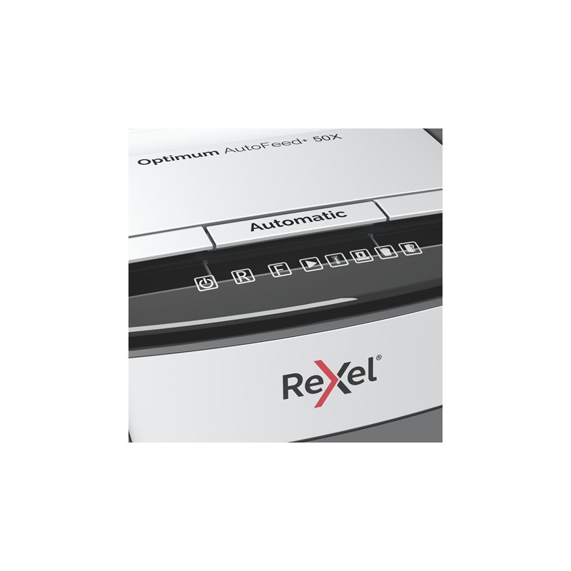 Distrugator documente automat REXEL Optimum 50X, P4, cross-cut (confeti), 50 coli, cos 20l, negru