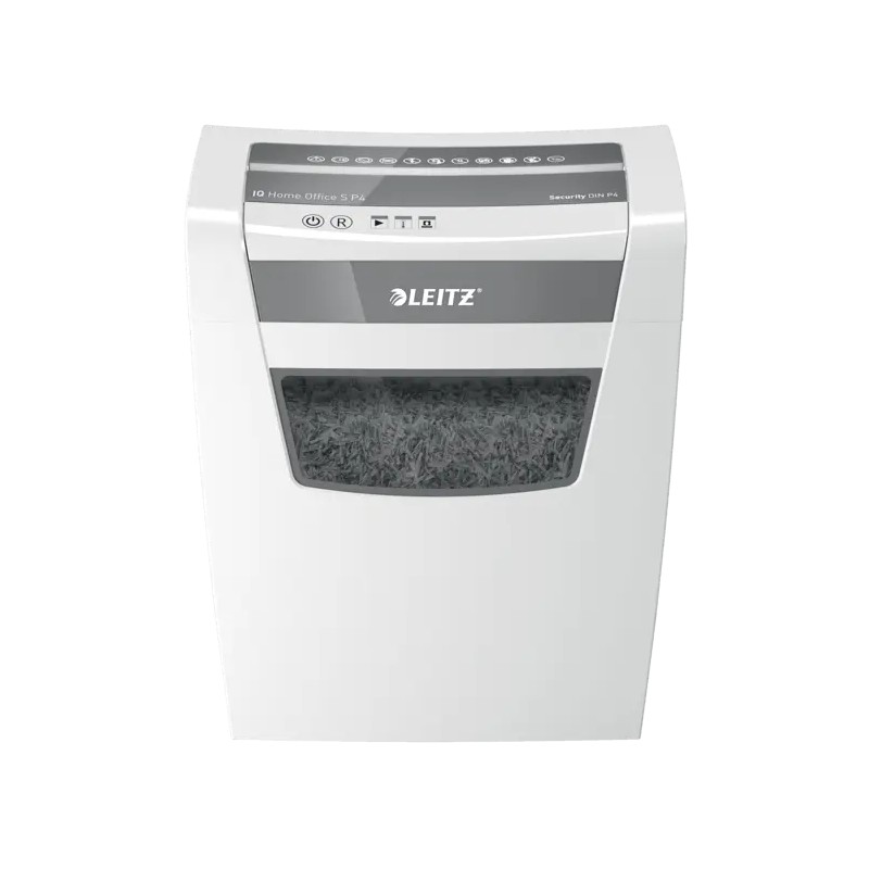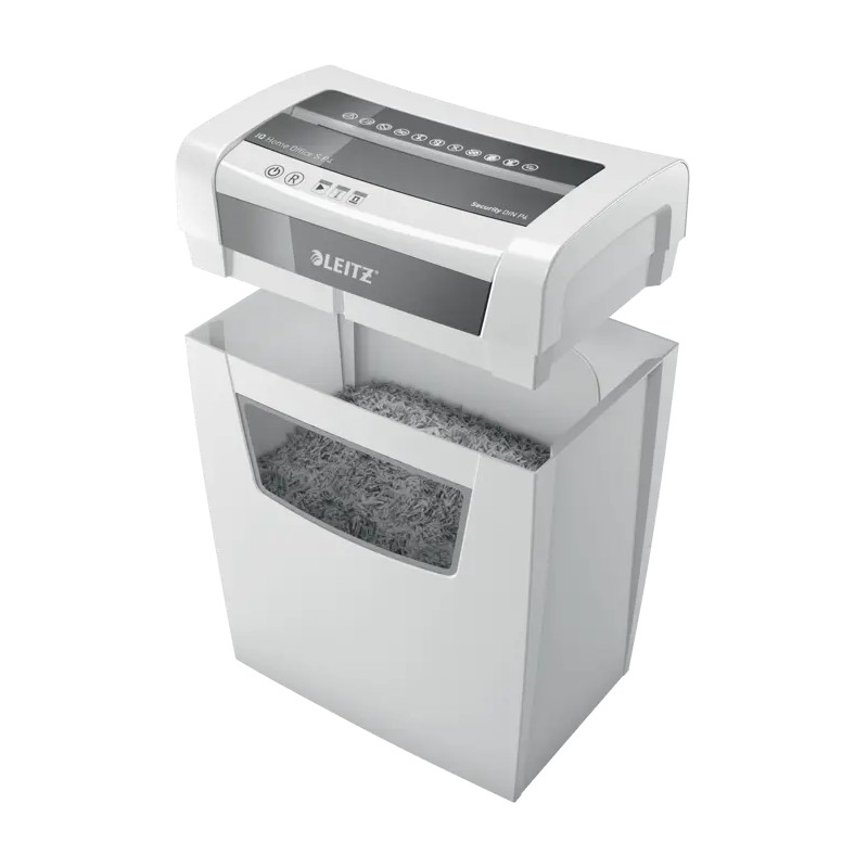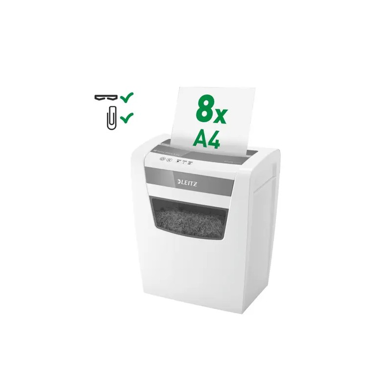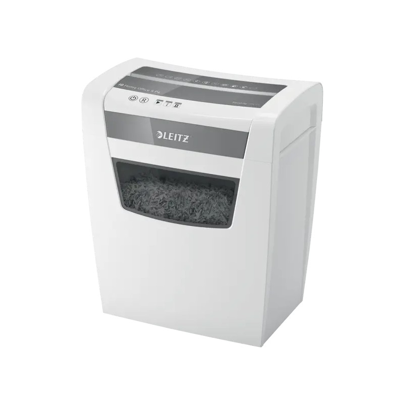 Distrugator documente manual Leitz IQ Home Office, P4, micro-cut (particule), 8 coli, cos 15l, silentios, alb-gri