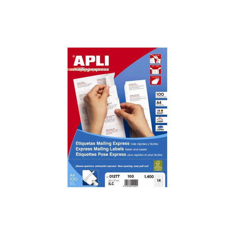 Etichetele albe Express mailing sunt ideale pentru etichetarea corespondentei dumneavoastra. Sistemul de desprindere a etichetei este inovator, acesta realizandu-se mult mai repede si usor printr-o singura miscare conform explicatiilor de mai jos. Designul cutiei este unic pe piata de profil. Accesul la etichete se face prin partea superioara a cutiei astfel permitand depozitarea prin suprapunere a cutiilor. Necesita spatiu redus pe birou.