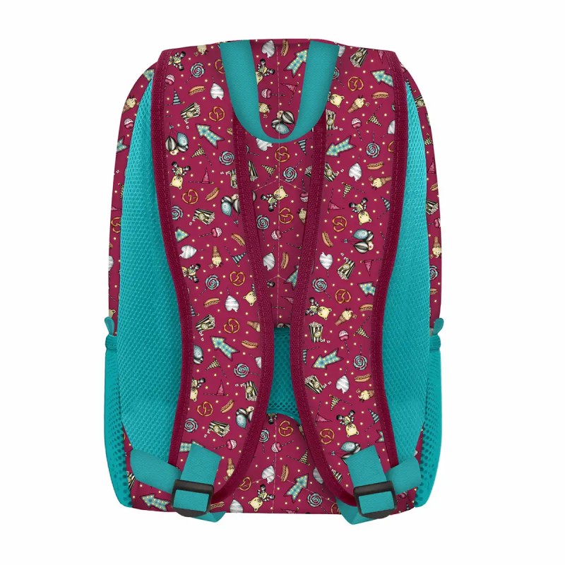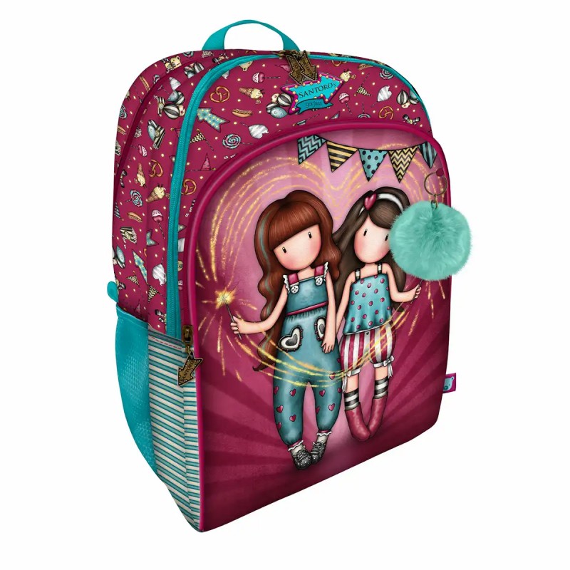 Compartimentarea eficienta ii permite fetitei sa isi organizeze bagajul mai usor. Are doua compartimente mari, complet captusite care se inchid cu fermoar bidirectional. Buzunarul frontal este mare, incapator captusit si inchis cu fermoar. Are atasat un breloc pom-pom extrem de pufos. Emblema Santoro London Gorjuss iese in evidenta atat prin culoare cat si prin designul sau unic. Cele doua buzunare laterale sunt din plasa, foarte utile pentru a tine la indemana sticla de apa sau alte lucruri de imediata necesitate.