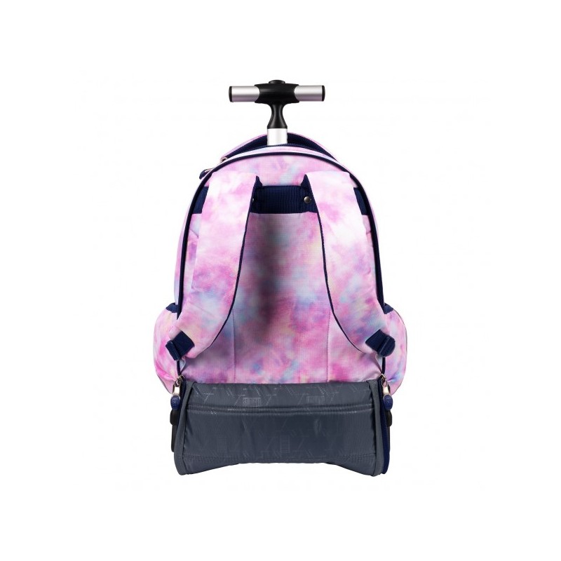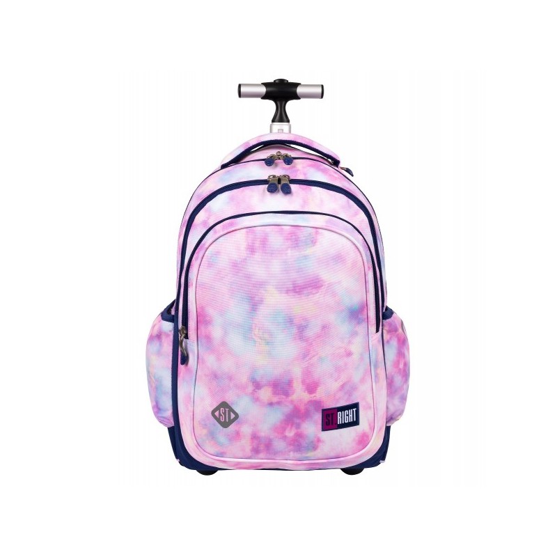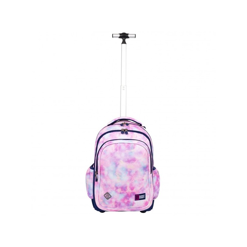 Ghiozdanul St.Right tip Troler, are 4 compartimente, maner telescopic reglabil pe 2 nivele si roti din silicon.