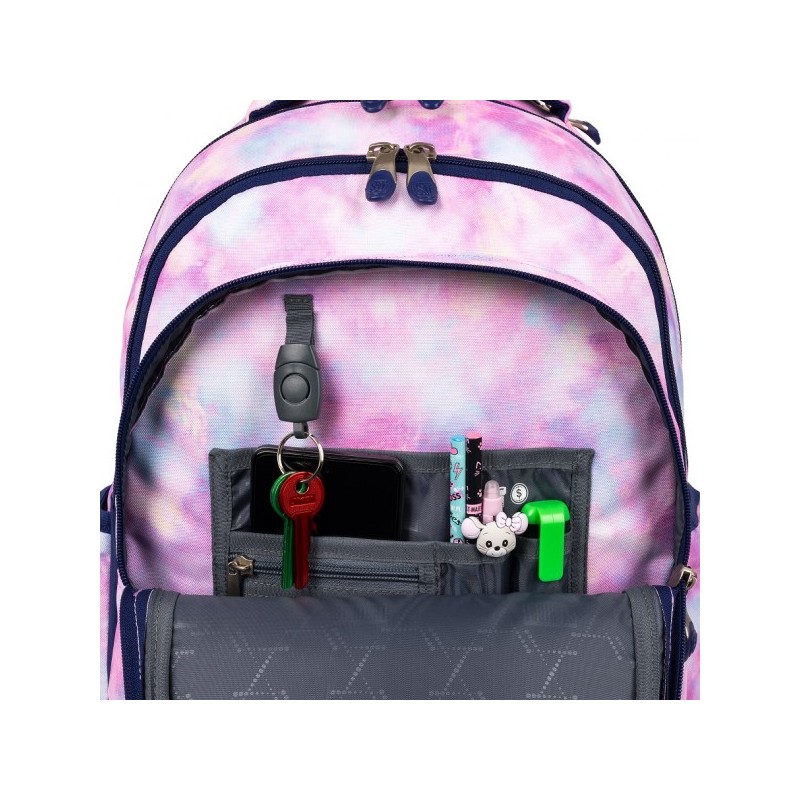 4. Compartimentul din fata, include organizator complex pentru telefon, breloc chei si spatii integrate pentru instrumentele de scris + un mic buzunar tip plasa cu fermoar.