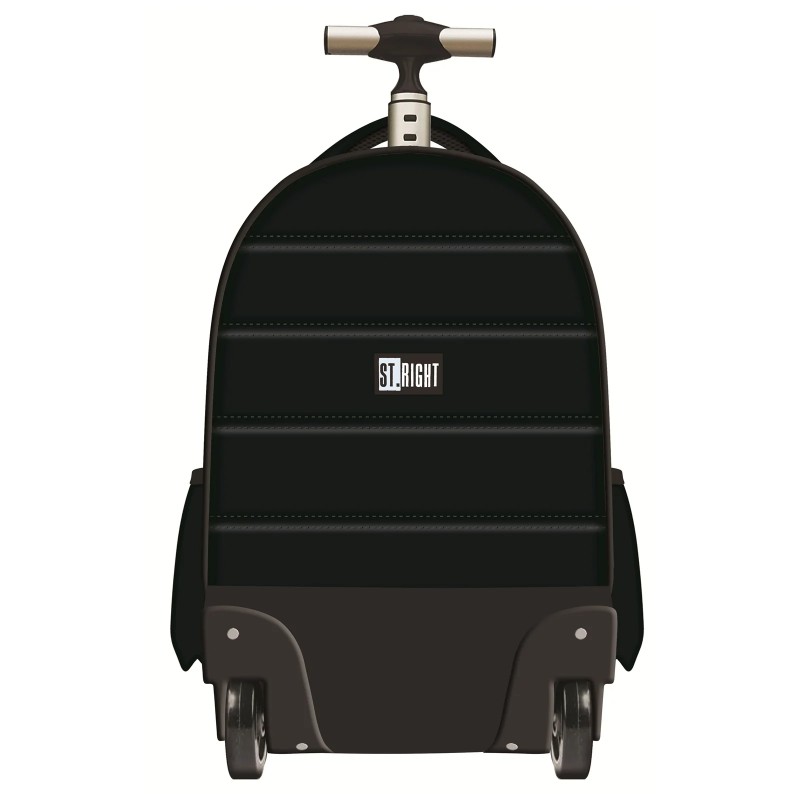 Ghiozdanul St.Right tip Troler, are 4 compartimente, maner telescopic reglabil pe 2 nivele si roti din silicon.