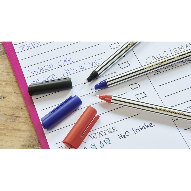 Acest fineliner este echipat cu un varf din plastic robust, care asigura o durabilitate mare chiar si la o grosime a liniei de doar 0.6 mm. Cerneala pe baza de apa este rapida la uscare si nu patrunde pe cealalta pagina, asigurand astfel un scris curat si clar. Capacul poate fi atasat la capatul corpului pentru a preveni pierderea acestuia, iar clema practica impiedica rostogolirea si permite atasarea pe diverse obiecte sau haine.