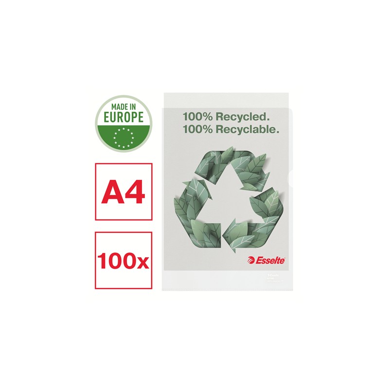 Mapă de protecție Esselte A4 nedăunătoare mediului, pentru folosirea zilnică, creată din material rezistent 100% reciclat PP. Pentru protejarea documentelor atunci când ești în mișcare, sau acasă. Mapele de protecție sunt ambalate în cutie de carton care este de asemenea 100% reciclată și reciclabilă.