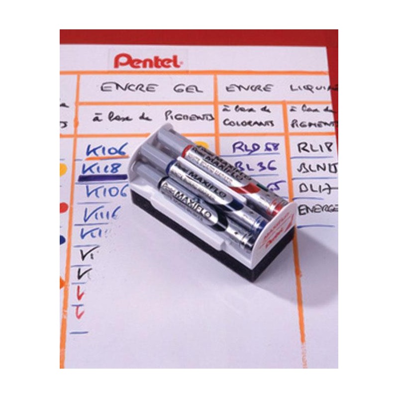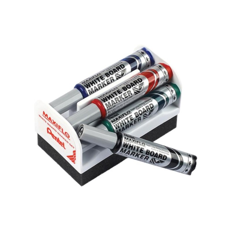 Set Maxiflo pentru tabla, format din 4 markere (negru, rosu, albastru, verde) si burete magnetic