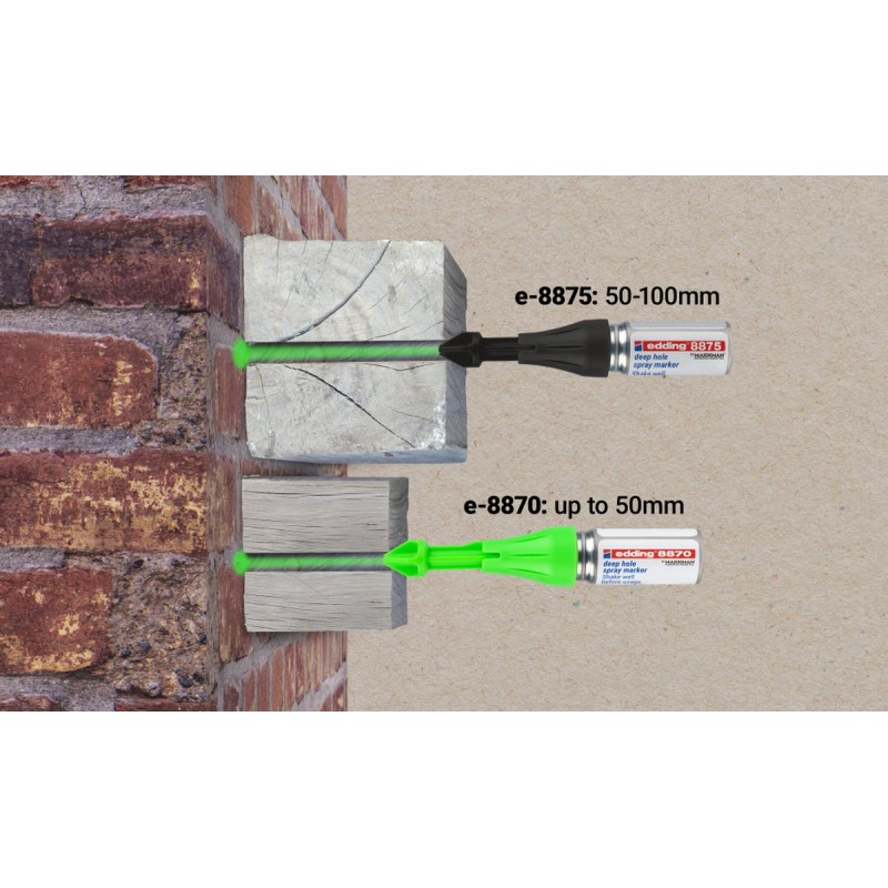 Edding 8875 este un spray pentru marcaje cu o tehnologie inovatoare, ideal pentru utilizare in locuri greu accesibile si pe aproape toate tipurile de materiale. Acest marker cu spray de creta are un mecanism de pompa patentat, permitand marcarea prin gauri de foraj cu adancimi de la 50 la 100 mm si diametre de la 3 la 13 mm. De asemenea, poate fi utilizat din orice unghi sau inaltime, chiar si deasupra capului. Creta nepermanenta este usor de sters de pe suprafetele inchise pentru corectii rapide.