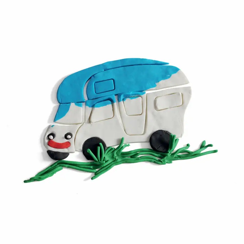 Pasta de modelaj fina, gluten-free, pachet 100 g, 4 culori asortate si o matrita cu diverse accesorii cu tema camping.