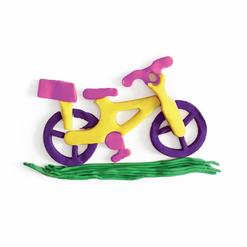 Pasta de modelaj fina, gluten-free, pachet 100 g, 4 culori asortate si o matrita cu diverse accesorii cu tema bicicleta.