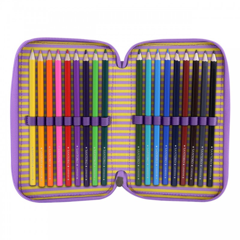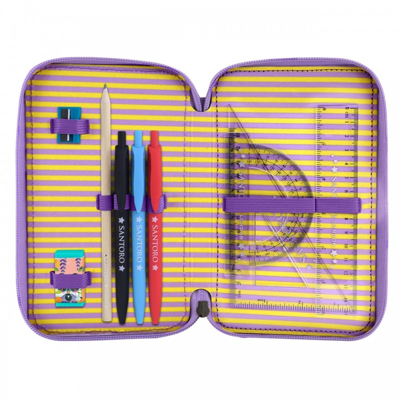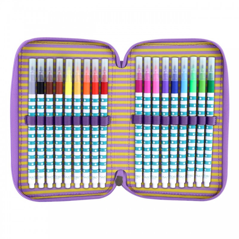 3 sectiuni cu fermoar care contin; 18x markere colorate, 18x creioane colorate, 1x creion HB, 1x radiera, 1x ascutitoare, 3x pixuri (rosu, negru, albastru), 1x raportor, 1x echer, 1x rigla de 15 cm.