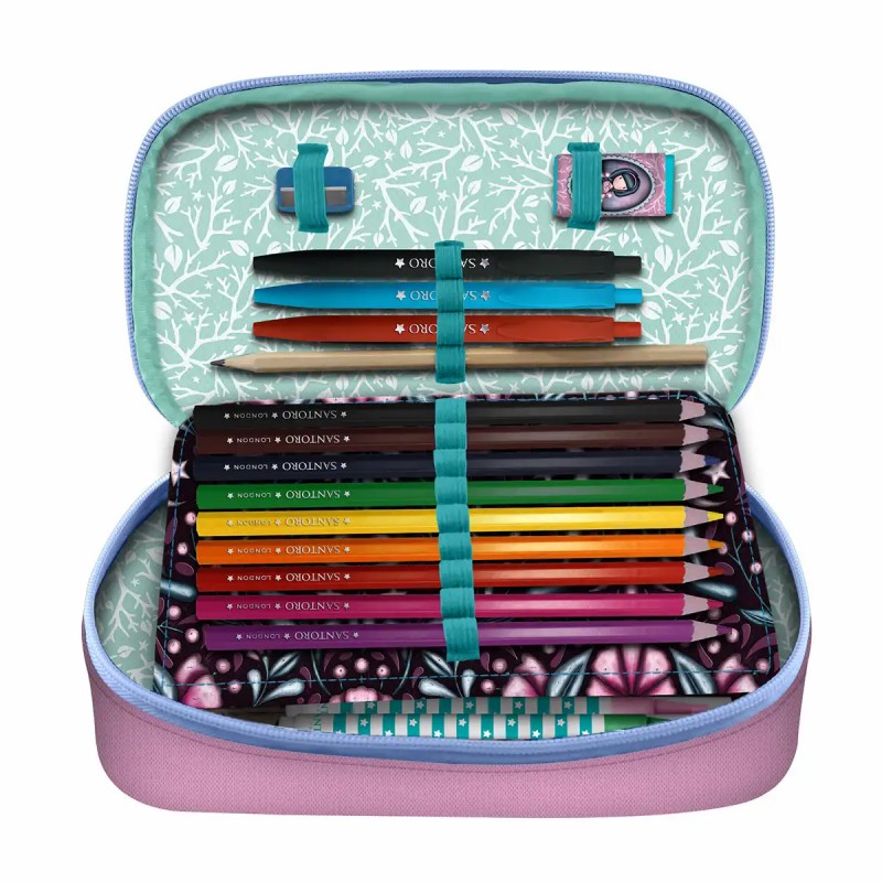 Descopera penarul pliabil 'Firefly Dawn', unde organizarea intalneste magia! Acest penar fermecator se deschide ca o carte de povesti, dezvaluind un organizator plin cu articole de papetarie: 18 carioci si 18 creioane colorate, alaturi de esentiale precum o ascutitoare si o radiera.