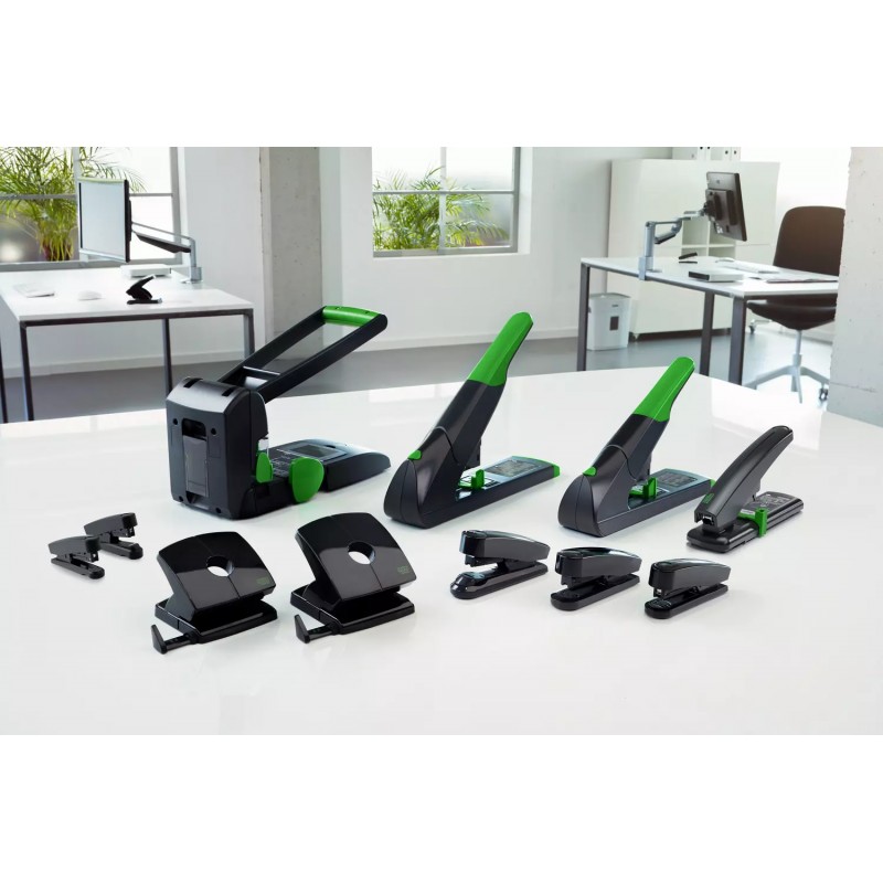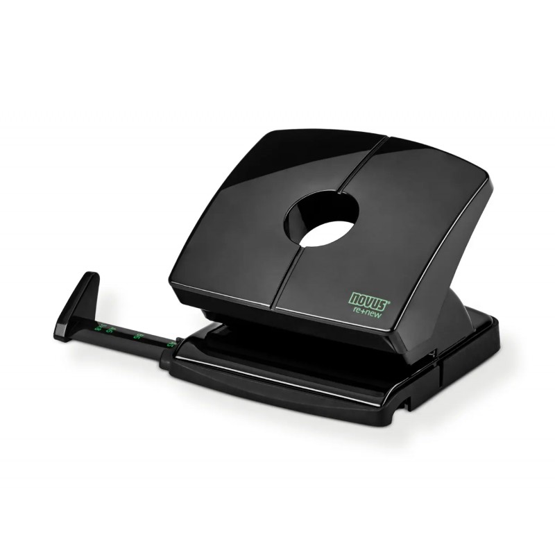Perforator de birou durabil pentru uz profesional, ghid de hartie cu fixare sigura simarcaje de format usor de citit. Dispozitiv complet din metal, cu capac din plastic cu finisaj in oglinda, realizat din material reciclat durabil.