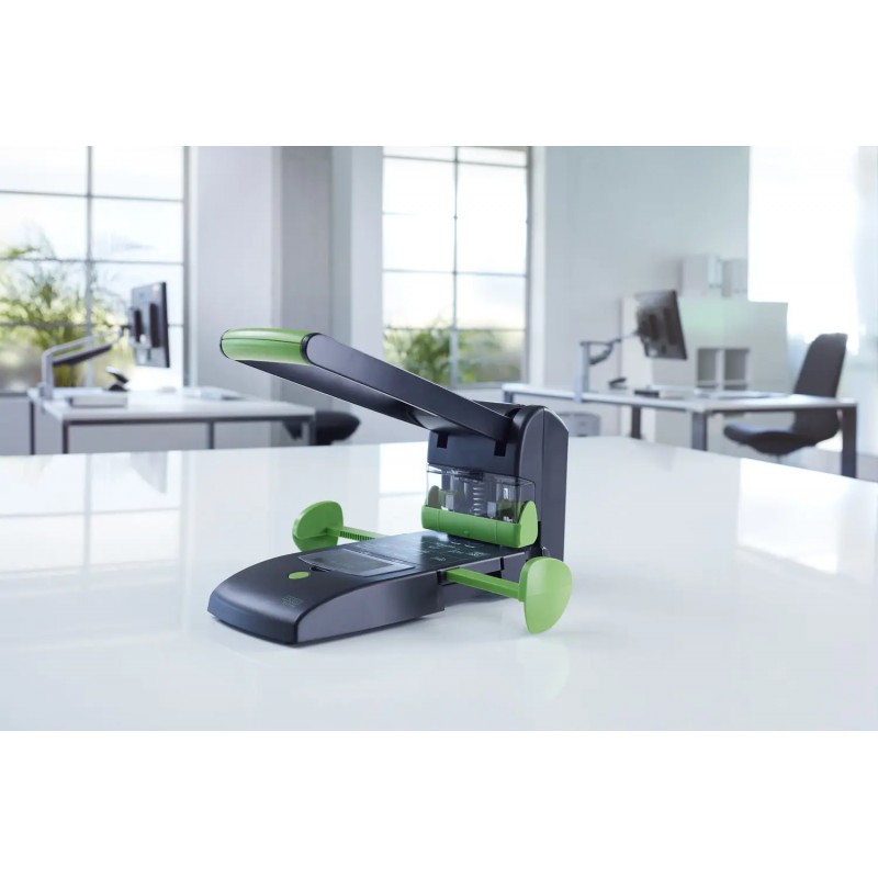 Perforator metalic de birou durabil pentru utilizare profesionala, prevazut cu unitate de reglare glisanta pentru perforare variabila in patru gauri. Ghid de centrare automat al hartiei pentru o perforare precisa.