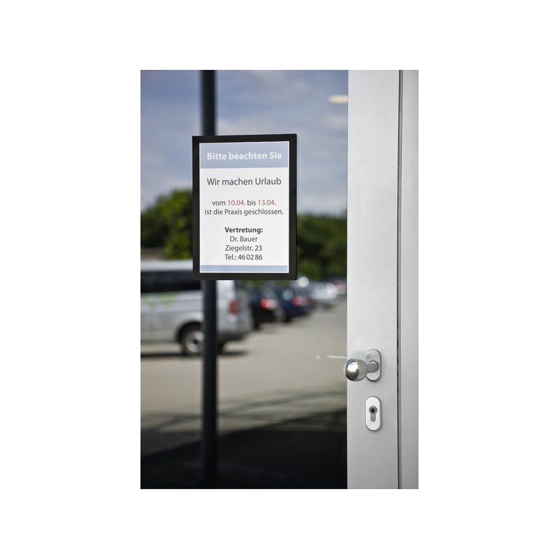 Ideal pentru afișarea unui anunț, flyer sau orice document care trebuie expus în spații precum secții de lucru, magazine, restaurante, saloane, recepții etc.