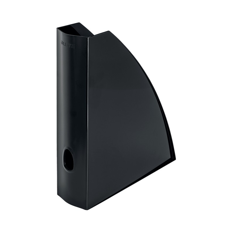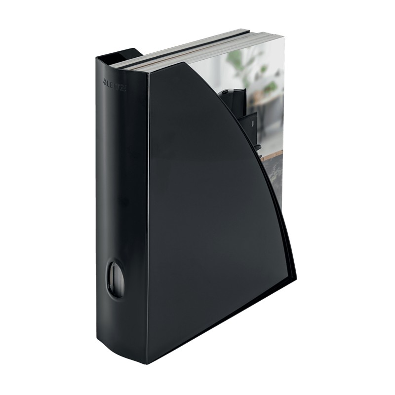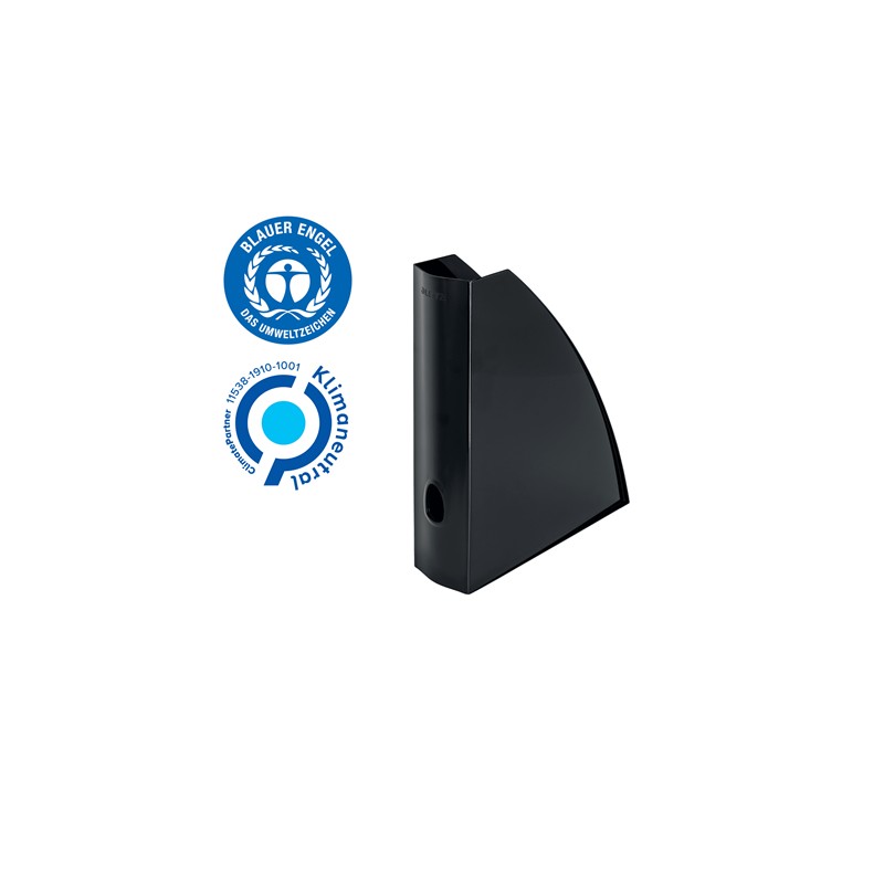 Cu un design care atrage atenția, suportul vertical Leitz Recycle este fabricat din plastic de calitate superioară, reciclat în proporție de 98% și potrivit pentru documente A4. Are un impact neutru asupra mediului, fiind certificat Blue Angel și 100% reciclabil