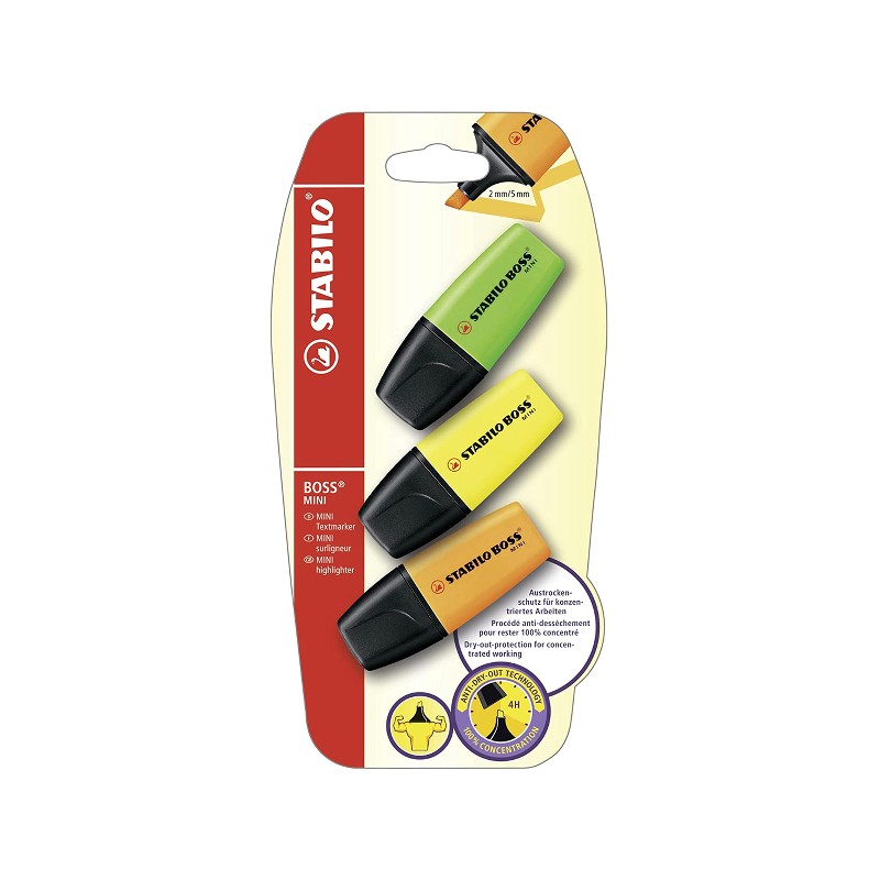 Textmarker Stabilo Boss mini, 3 culori/blister, galben, verde, portocaliu.